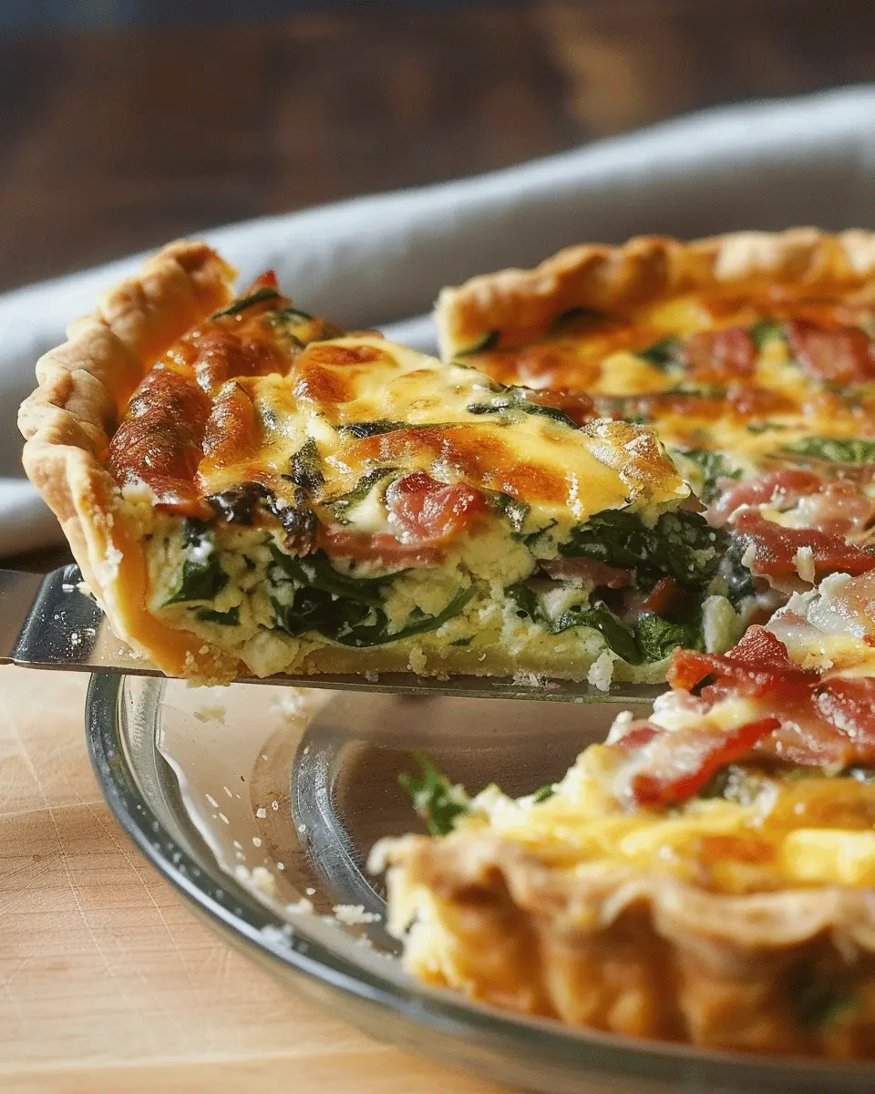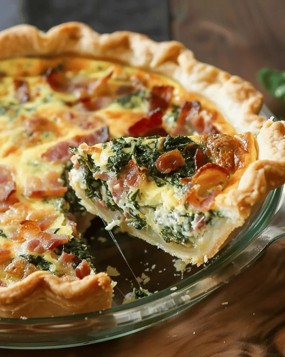 A delicious and easy recipe for a Bacon Spinach Quiche featuring turkey bacon, perfect for brunch.
