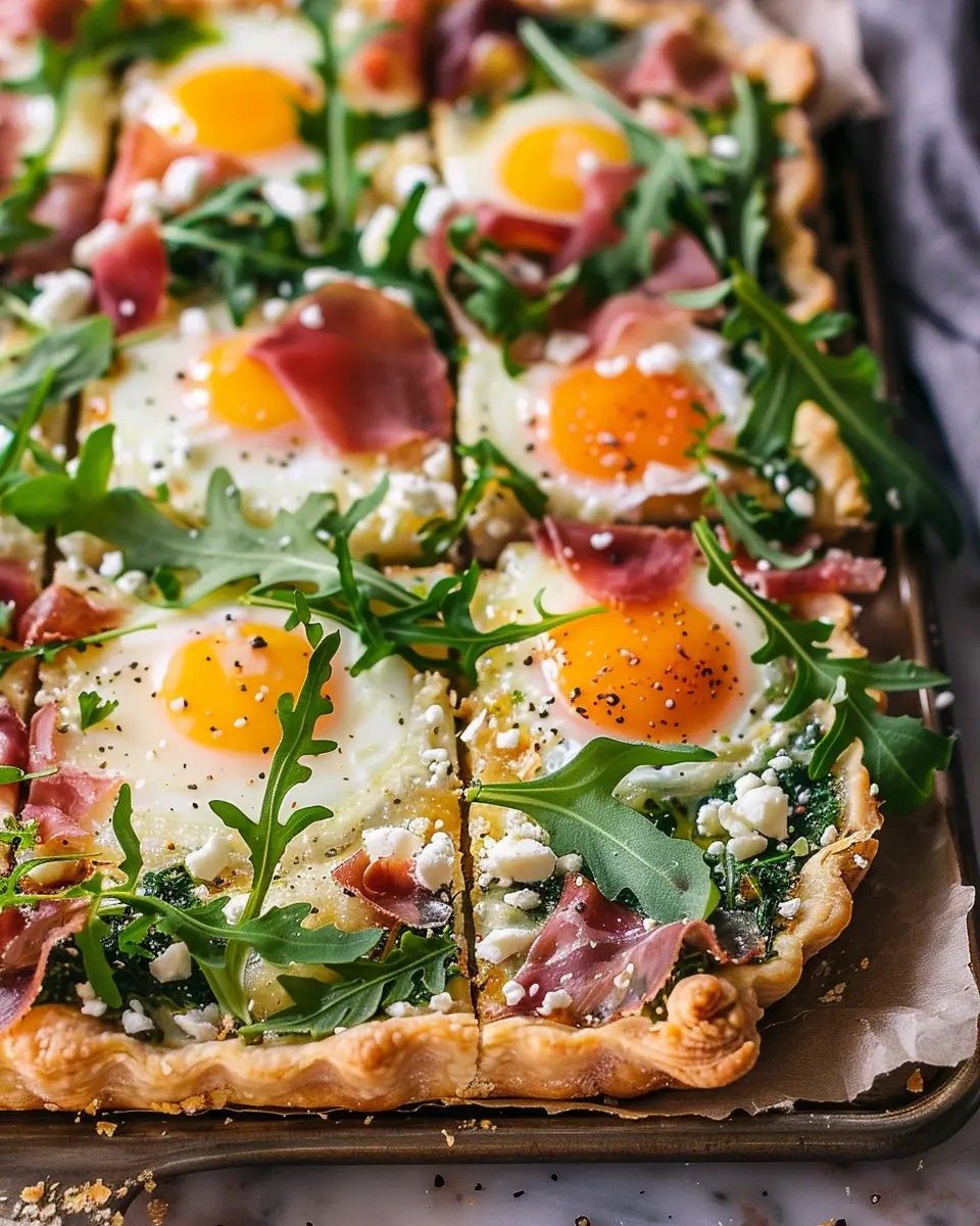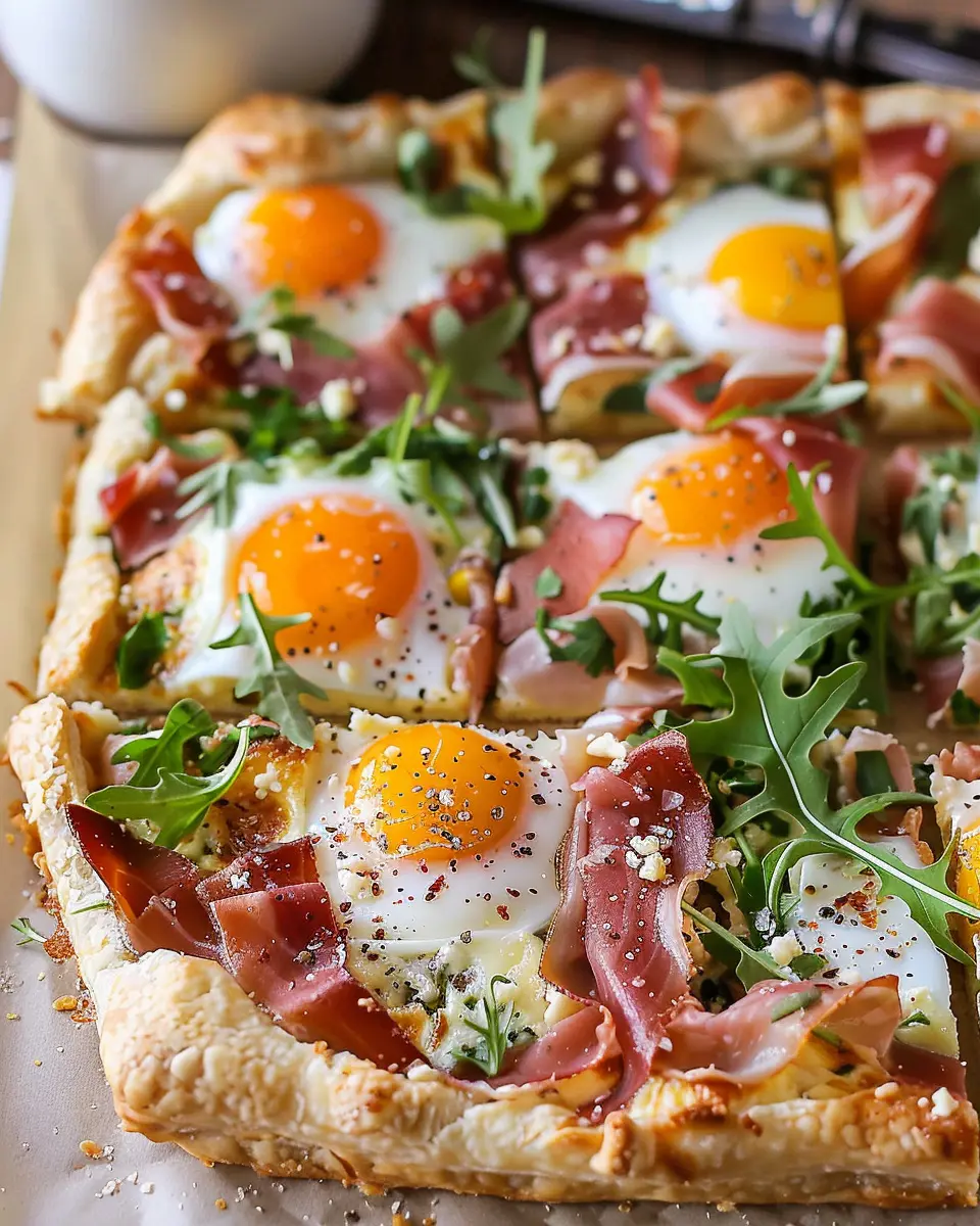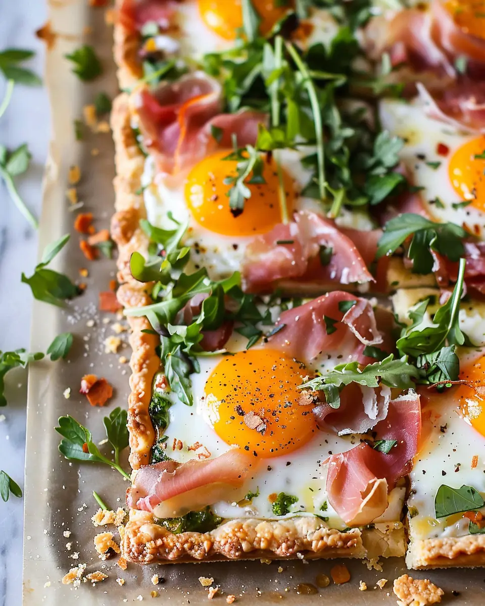 A delicious and indulgent breakfast tart featuring prosciutto and eggs.