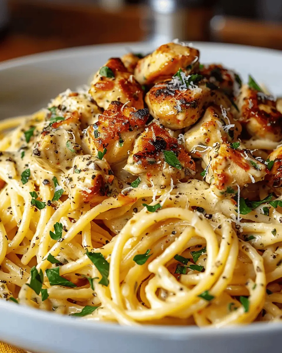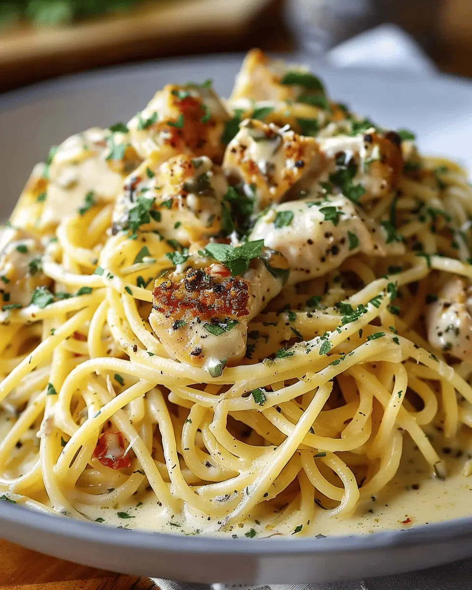 Mix: In the sauce, add the cooked spaghetti and sliced chicken. Toss gently until everything is evenly coated in that creamy, cheesy goodness.