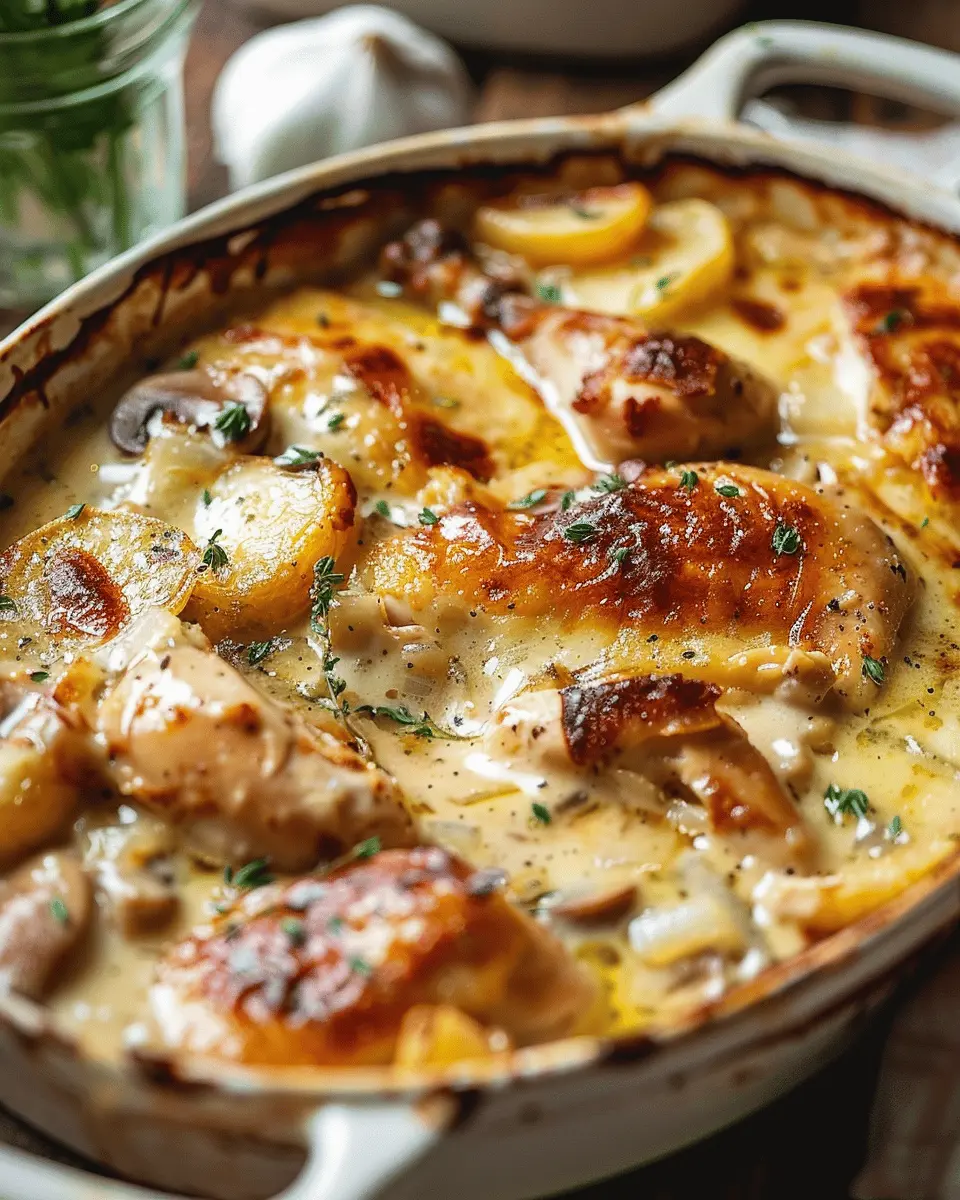 One delightful twist on the classic French Chicken Casserole is using apple cider instead of chicken broth. The natural sweetness and acidity of apple cider bring a rich flavor dimension that complements the dish beautifully. Simply substitute one cup of broth with a cup of apple cider; the result will be a subtly sweet and aromatic meal. Adding a splash of apple cider vinegar can enhance that tangy flavor, making each bite even more intriguing. This variation pairs wonderfully with crisp, roasted vegetables like carrots and parsnips for added depth.