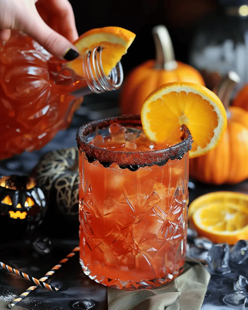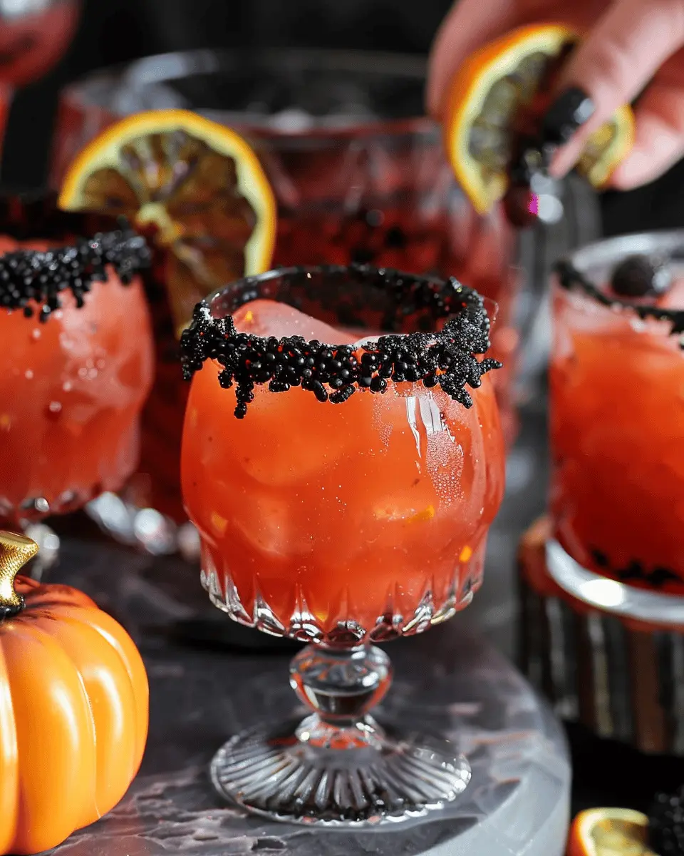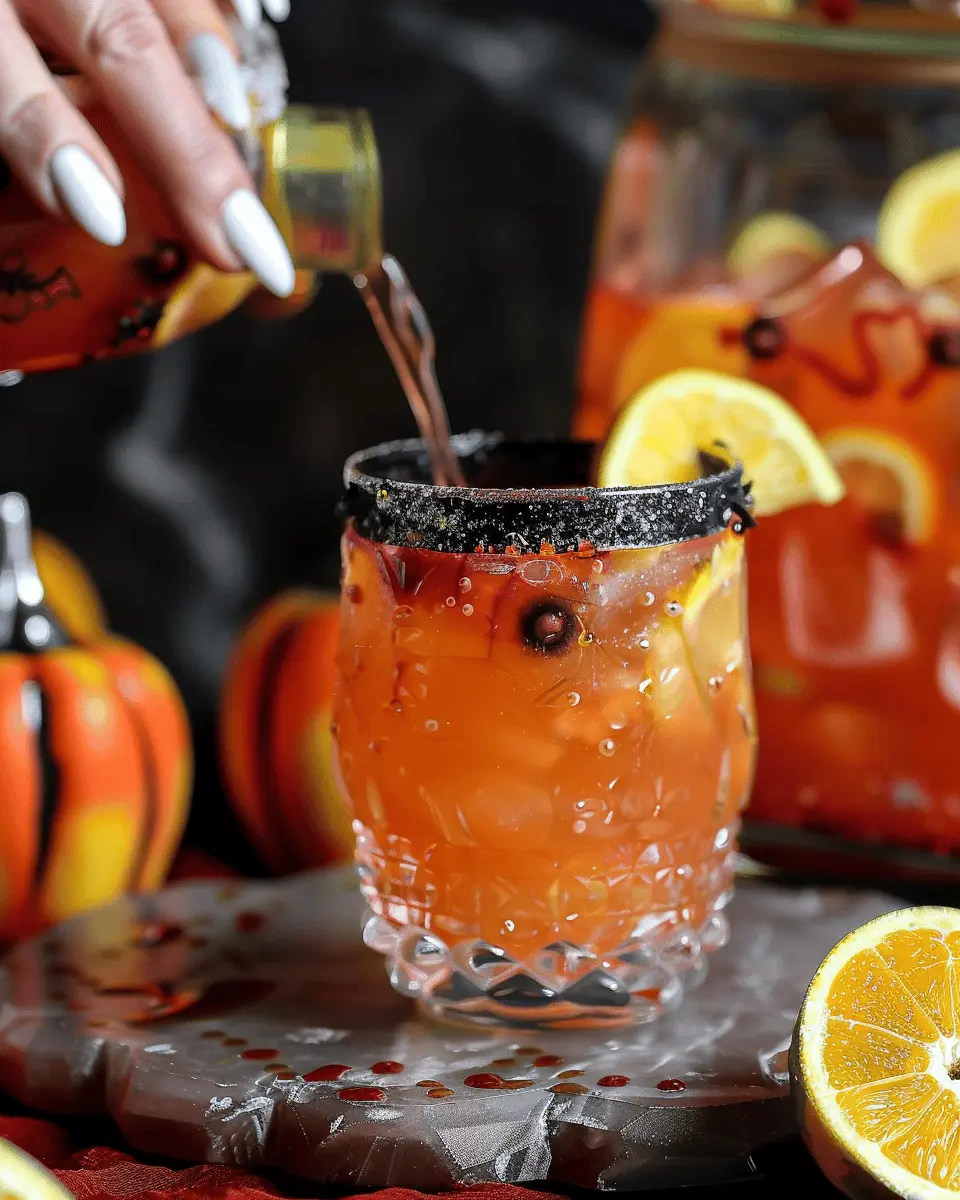 • Garnishes: Float orange and black fruit slices on top, like blood oranges and blackberries, for an eerie yet elegant touch.