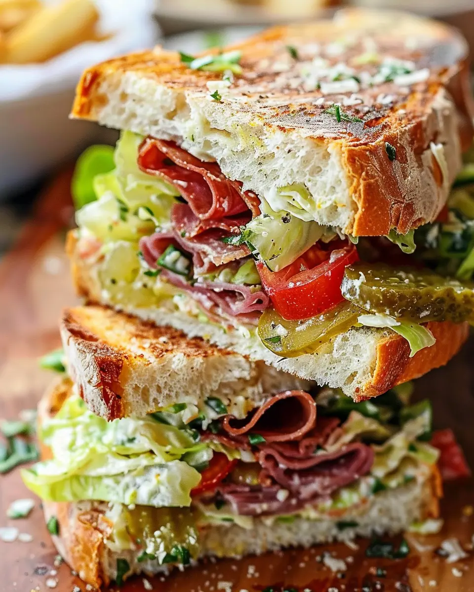 The Italian Grinder Salad Sandwich is a vibrant, delicious creation rooted in Italian-American cuisine. Historical evidence suggests that this sandwich gained popularity in the Northeast, particularly in states like Connecticut and New Jersey, where you can find bustling delis filled with eager patrons. Originally inspired by hearty Italian subs, this sandwich showcases a delightful mix of fresh vegetables, savory meats, and zesty dressings—all nestled in a crusty Italian roll. Made with an assortment of ingredients like turkey bacon, chicken ham, peppers, onions, and a tangy vinaigrette, it’s a perfect marriage of flavors that speak to warm summer days or any time you crave something crisp and filling.