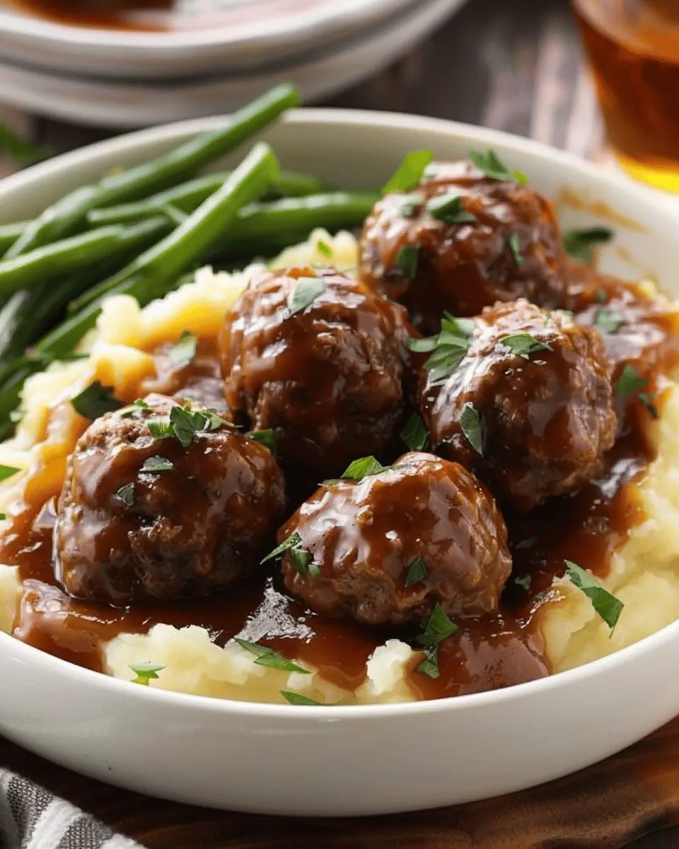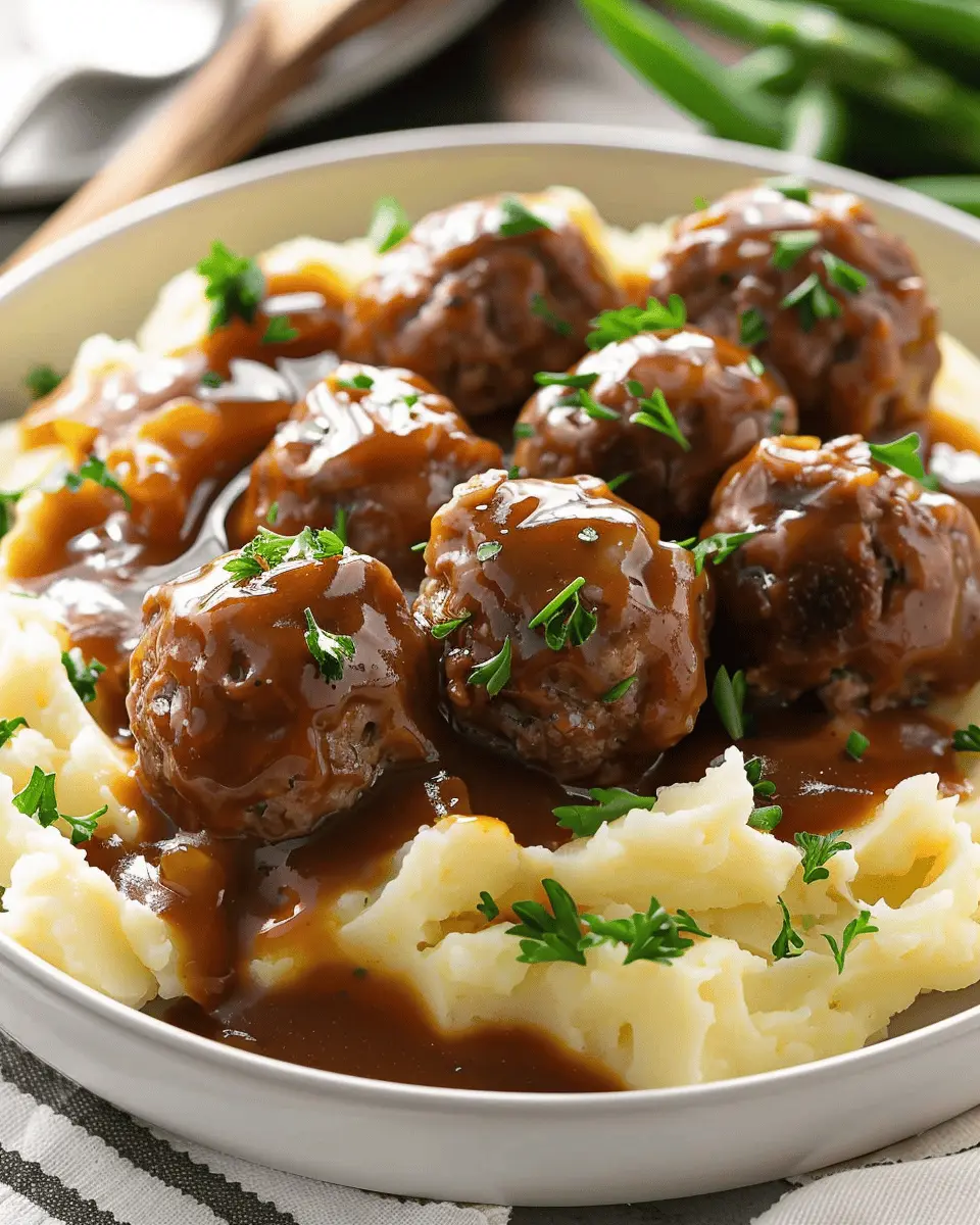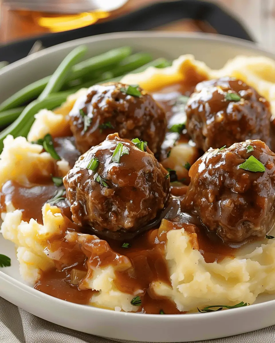Indulge in the rich flavors of Salisbury meatballs served with creamy mashed potatoes, perfect for a comforting meal at home.